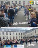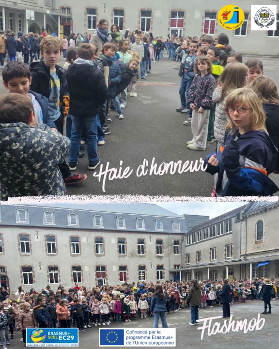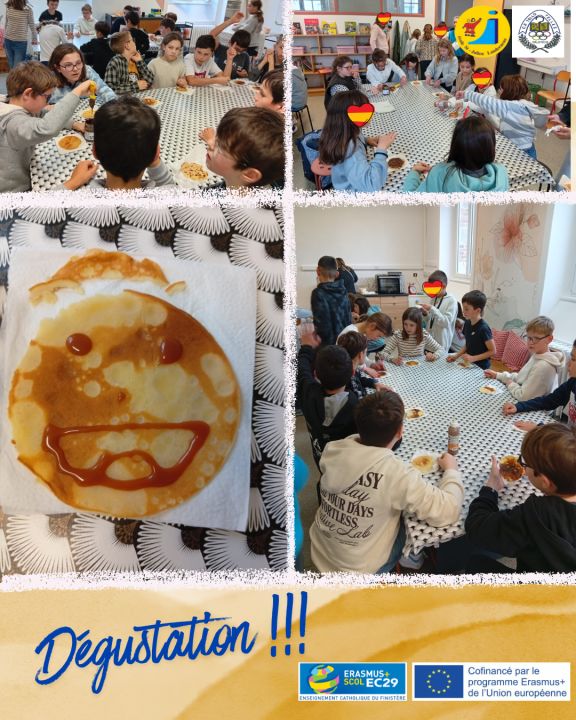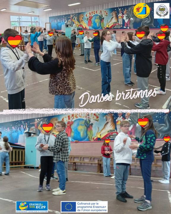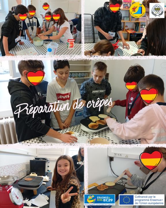 Nos partenaires espagnols de Palencia ont eu un accueil à l'européenne : haie d'honneur de toute l'école sur l'hymne européen puis flashmob de l'Ugsel29. Pour leur premier jour, après des défis maths avec nos élèves, des jeux de langues français-espagnol-anglais, nous les avons immergés dans la culture bretonne : apprentissage de danses bretonnes, préparation de crêpes et dégustation... avec du caramel au beurre salé évidemment !!!!