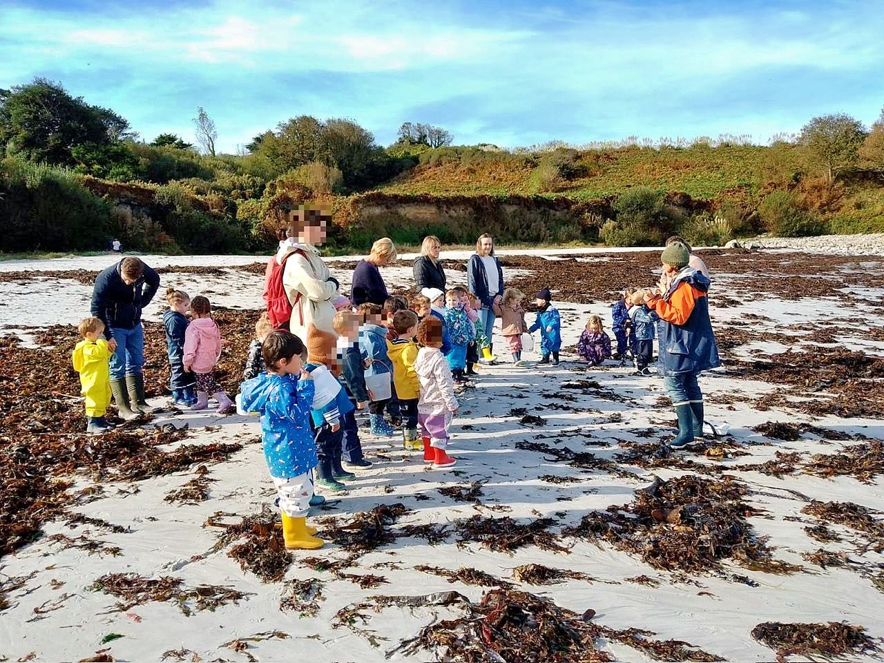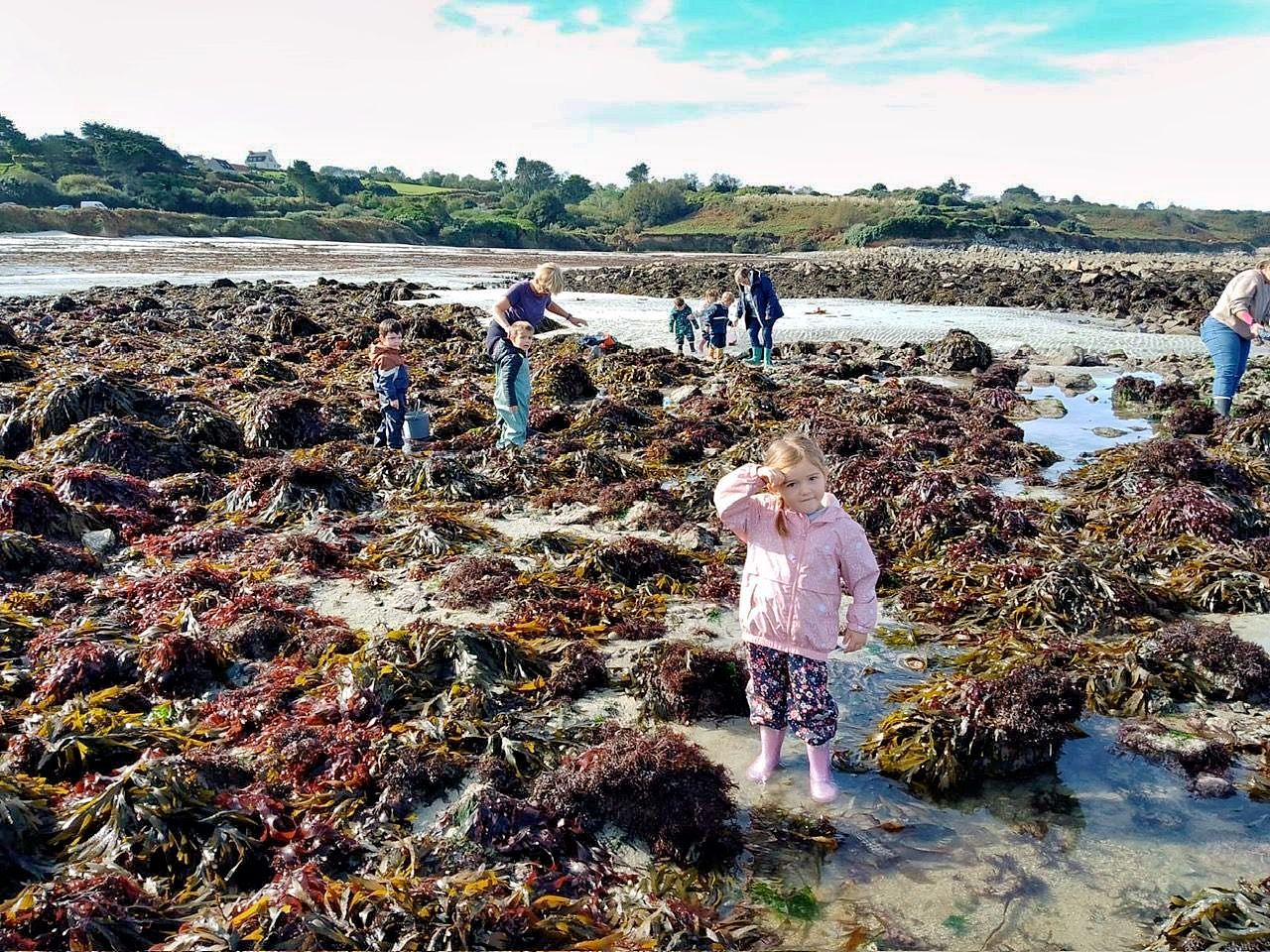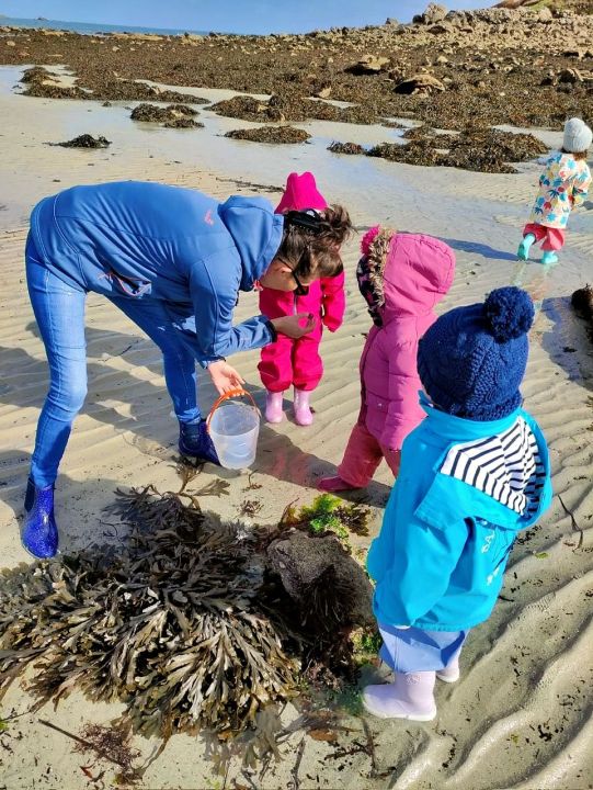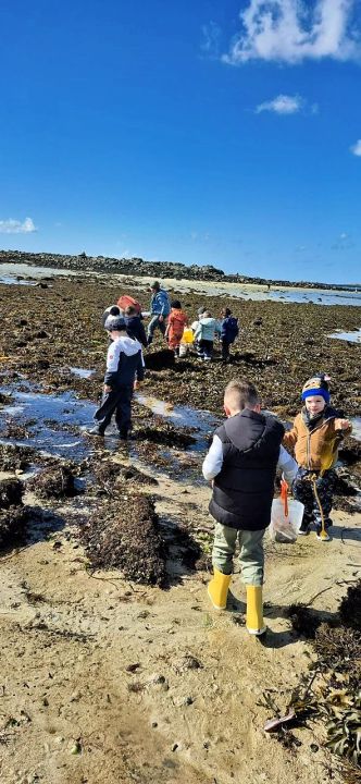 Nos petits élèves de maternelle munis de leurs bottes et leur combinaison d’Ecole du Dehors se sont déplacés à Plouguerneau en septembre et octobre pour découvrir les êtres vivants de l’estran. Danielle Prigent de l’association Piokan a favorisé cette première découverte du milieu marin et a permis à ces petits explorateurs de s’initier à la pêche à pied et au land’art pour mieux s’approprier leur environnement proche.